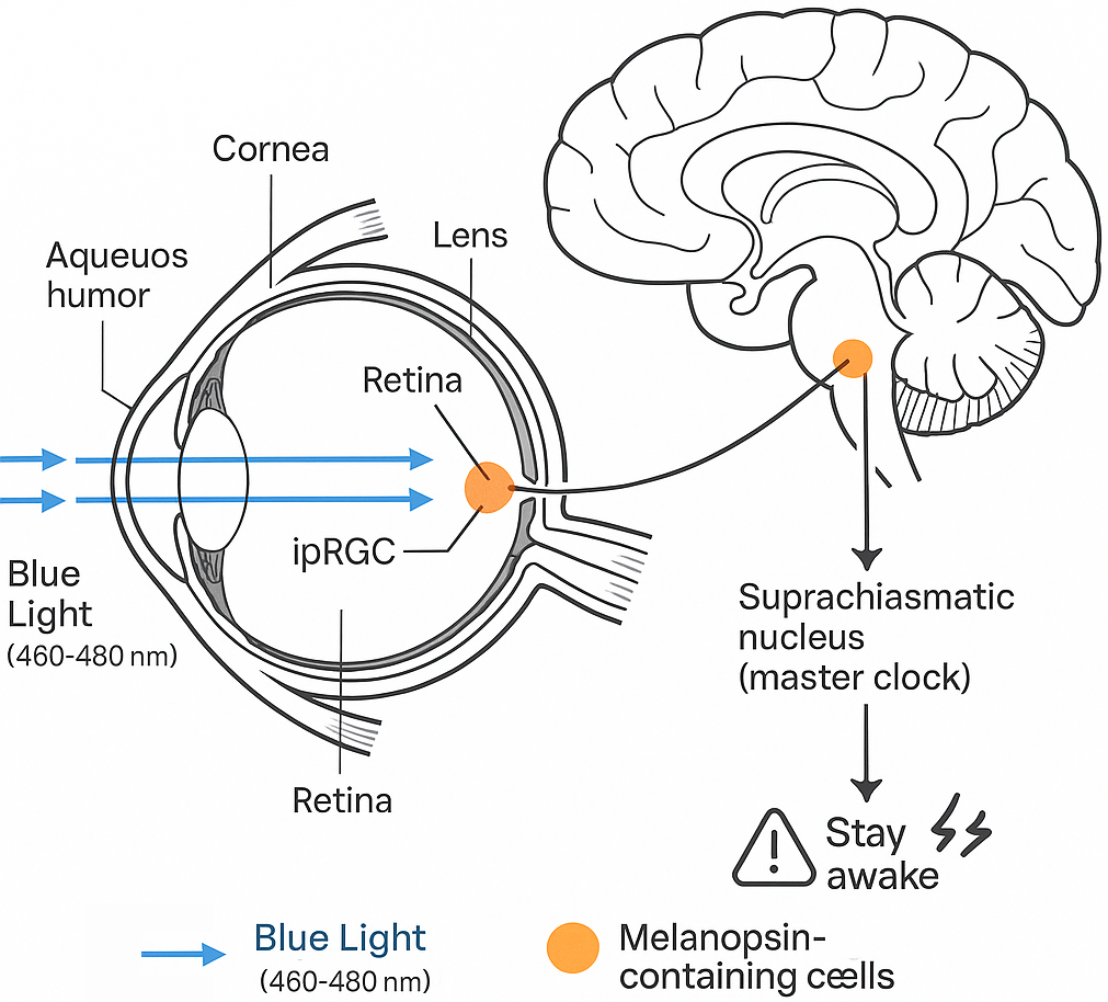 The Melanopsin Connection: Your eyes contain specialized cells called intrinsically photosensitive retinal ganglion cells (ipRGCs) that contain a protein called melanopsin. These cells are exquisitely sensitive to blue light at 460-480nm and directly communicate with your brain's master clock.